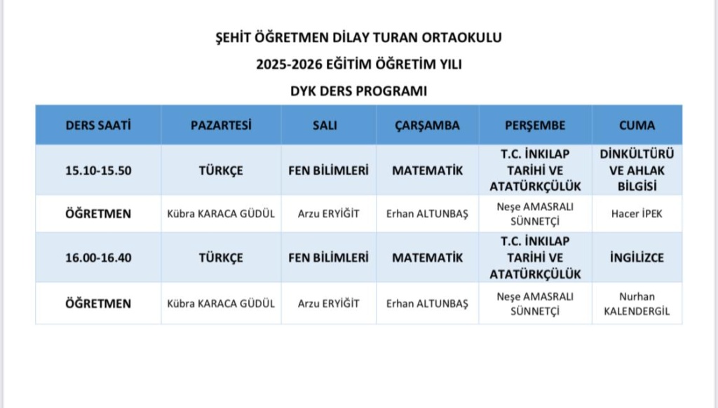 8. sınıf öğrencilerimiz in Destekleme ve Yetiştirme Kursu ders programı aşağıda yer almaktadır.