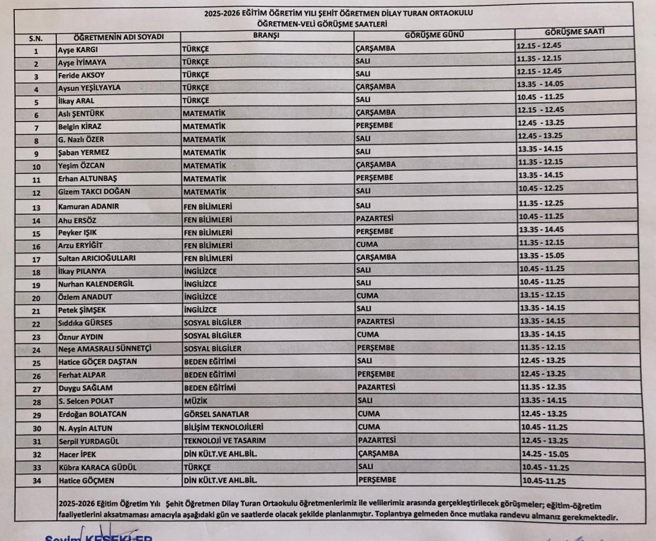 2025-2026 Eğitim Öğretim Yılı öğretmenlerimiz ile velilerimiz arasında gerçekleştirilecek görüşmeler; eğitim-öğretim faaliyetlerini aksatmayacak şekilde planlanmıştır. Öğrencilerimizin akademik, kültürel, sosyal vb. gelişimlerini takip edebilmek, okul veli işbirliğini artırmak için öğretmen, veli ve öğrenci görüşmelerini daha etkili ve verimli kılmak amacıyla belirlenen gün ve saatlerde öğretmen görüşmelerini gerçekleştirmeniz rica olunur.